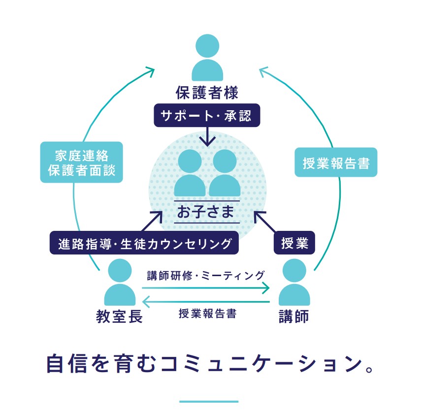 生徒、保護者様、そして教室長・講師が一体となる「承認のトライアングル」が、お子様の自己肯定感を高め、成長を加速させます 。